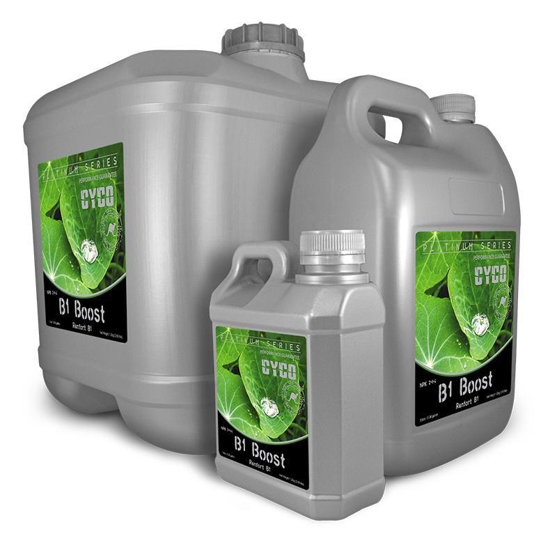 Cyco Platinum Series B1 Boost is an additive used throughout the vegetative and flowering periods of plant growth. Used at higher concentrations in vegetative growth than flowering, B1 Boost contains high amounts of the natural vitamin B-1 also known as thiamine. Thiamine is a natural vitamin that is present in the plant, natural bacteria excrements, and native fungi. By providing a constant presence of thiamine, root growth is encouraged thereby allowing for healthy new growth. B1 Boost is also a strong source of pharmaceutical grade potassium. A necessary ingredient to plant growth enzymes, protein formation, and the translocation of sugars, potassium in B1 Boost allows for vibrant, healthy growth. Available in 1, 5, 20 Liters also in commercial quantities.